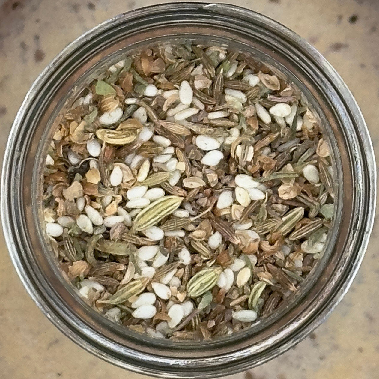 Coriander Seeds, Cumin Seeds Whole, Fennel Seeds, Thyme Leaves, Marjoram Leaves, Black Peppercorns and Sesame Seeds.